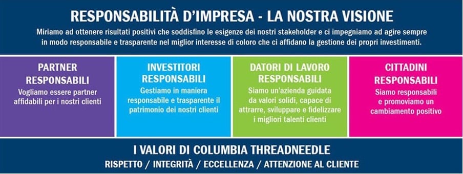 Columbia Threadneedle Investments è un gruppo di asset management leader a livello globale che offre un’ampia gamma di soluzioni e strategie d’investimento a gestione attiva per clienti individuali, fondi pensione e imprese. Puntiamo a offrire i risultati che i clienti si attendono quando ci affidano il loro denaro, adottando un approccio di investimento basato sul lavoro di squadra e sulla connessione a livello globale, imperniato sulla ricerca e attento ai rischi. Siamo egualmente impegnati a garantire un approccio rigoroso in materia di responsabilità d’impresa, che si fonda sui valori aziendali che ci siamo dati: attenzione per il cliente, eccellenza, integrità e rispetto. Tutto il nostro operato deve tendere a questi valori, in qualsiasi circostanza.